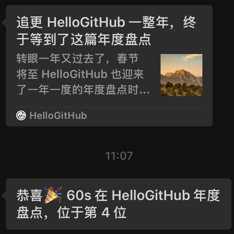 🎉 60s API 位列 HelloGitHub 年度盘点 第四名。